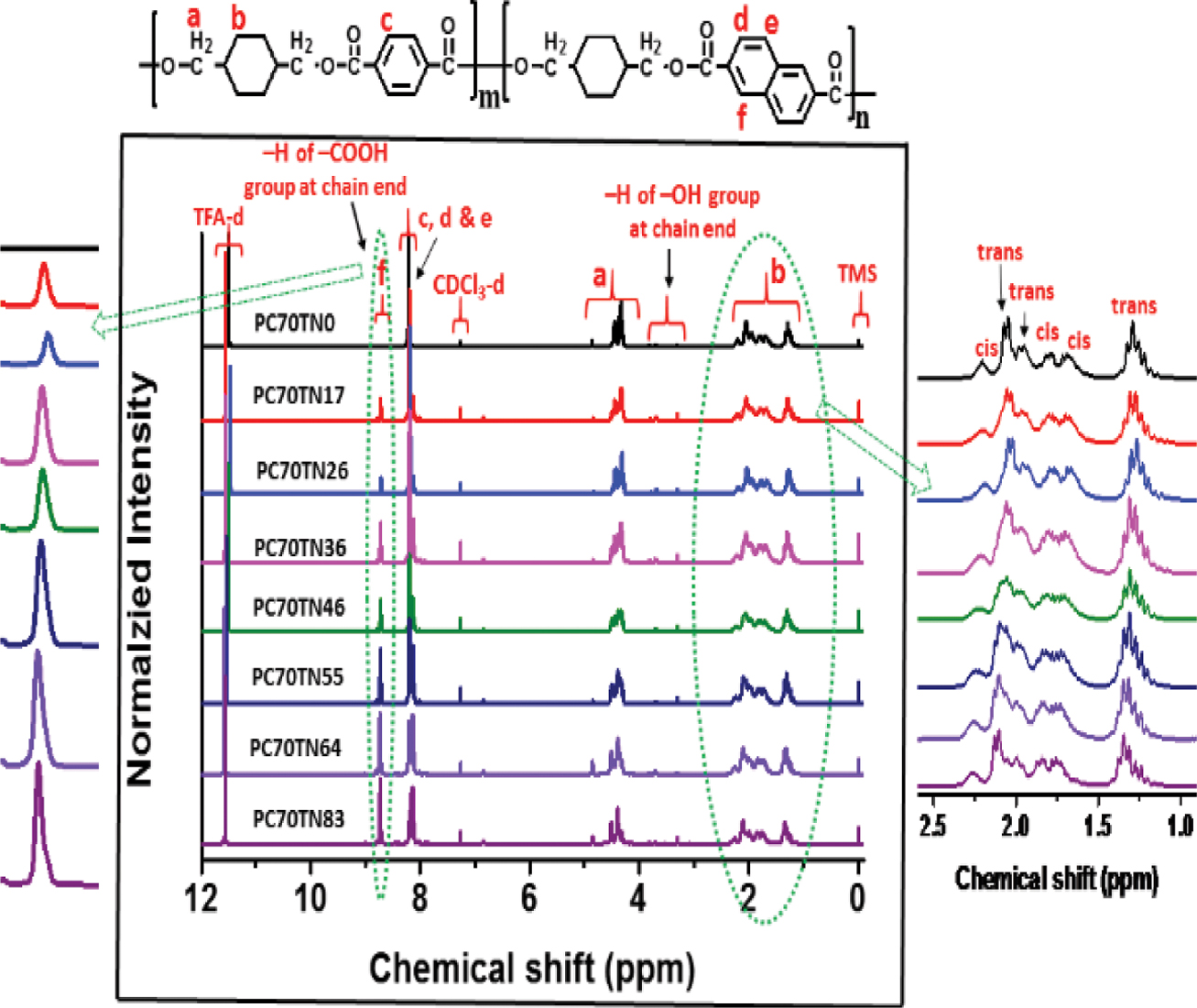It would be a great effort to introduce a synthesis of novel thermally stable copolyesters by using the advantageous features of trans-isomers of diol (CHDM) and second dicarboxylic acid (NDA), simultaneously. To the best of our knowledge, only one industrial patent36 is reported in which thermal and mechanical properties of copolyester film are controlled by utilizing the effect of stereochemistry of CHDM and second dicarboxylic acid (NDA). However, very limited information was provided in this patent. For the first time, we are reporting a detailed academia research showing the effect of both NDA (second diacid) and stereochemistry of diol (cis-/trans-CHDM) on the thermal properties of synthesized two series of copolymers, PC70TN# and PC100TN# containing 70 and 100% trans-CHDM isomers, respectively. They were synthesized by a short, simple, controlled, and straightforward one-step solution polymerization method. It is important to note that any kind of metallic catalyst or additional stabilizer is not used during the whole synthesis, so eliminating any kind of toxicity related issues. This study mainly focusses three parts: (1) introduction of a novel solution polymerization approach for the synthesis of two series of copolymers, at room temperature in the absence of toxic metallic catalysts and stabilizer; (2) characterization of synthesized copolyesters and (3) study the effect of stereochemistry of CHDM and naphthalene units on the thermal properties of synthesized copolyesters. So, in this study, the crystal structure and thermal properties of PCT homopolymers were controlled by the ratio of cis-/trans-CHDM isomers and the second dicarboxylic acid.