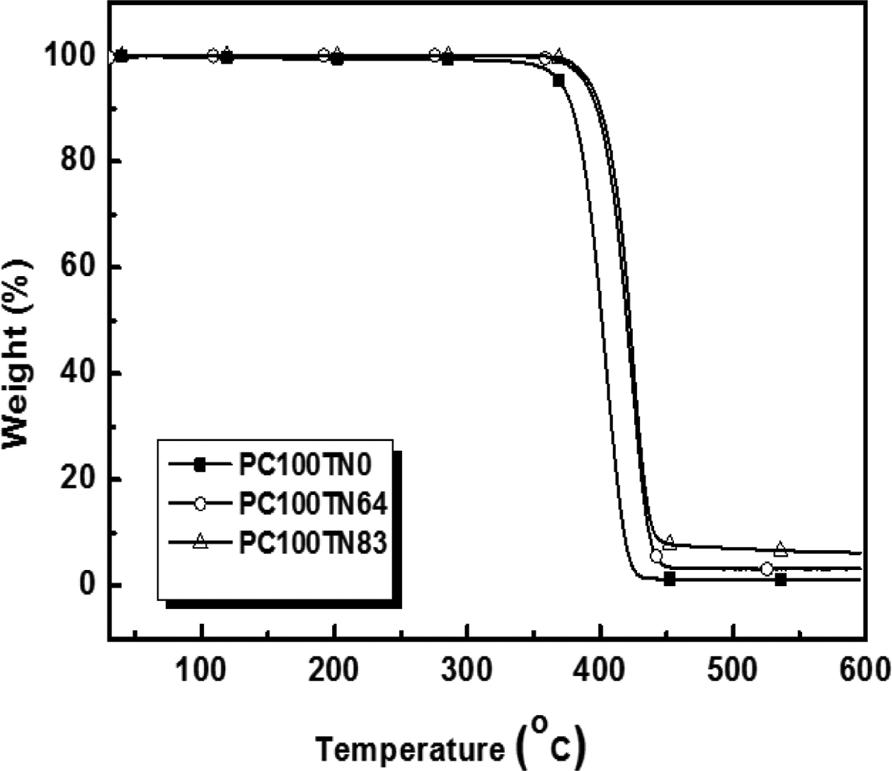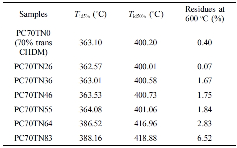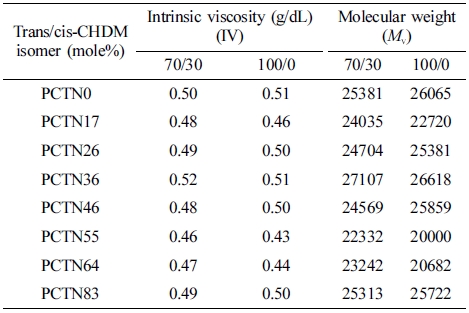 It is evident from these data that naphthalene units effectively improve the heat stability of synthesized copolyesters. Not only naphthalene unit but stereochemistry of 1,4-CHDM (trans/cis content) also improve the comprehensive properties of copolyesters.17-21 Most important finding of this is that PC100TN# copolyesters have superior thermal properties when compared with PC70TN# copolyesters. This behavior can be attributed to trans-CHDM isomers which impart more symmetry and rigidity to their molecular structure.