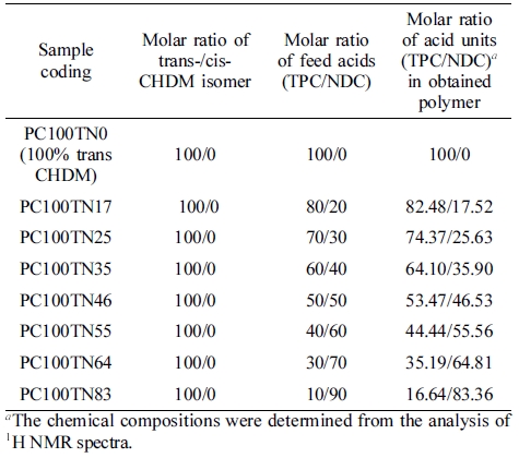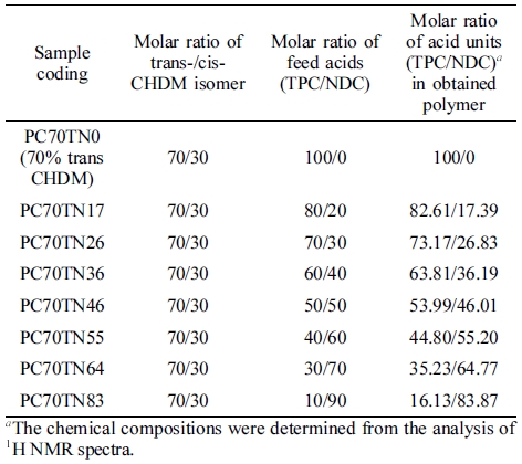Two series of copolyesters based on CHDM and TPC/NDC mixture, PC70TN# and PC100TN# (C = CHDM, numbers after C = mole% of trans content of trans/cis isomer in CHDM, T = TPC, N = NDC, and number after N = mole% of NDC content in diacid unit (TPC/NDC)) copolyesters, were synthesized by the procedures described above. Both series of copolyesters were prepared with different composition of NDC and TPC as summarized in Tables 1 and 2, respectively.