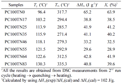 where ΔHm(exp) is the melting enthalpy determined by DSC experiment and ΔHm(cal) is the melting enthalpy of 100% crystalline PCT which is calculated by adopting a group contribution theory.43,44 Inherent thermal properties of synthesized copolyesters were determined after eliminating the thermal history by applying heating-cooling cycle. All the DSC results were determined during the second heating cycle.
