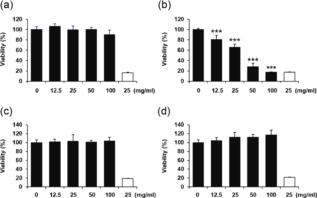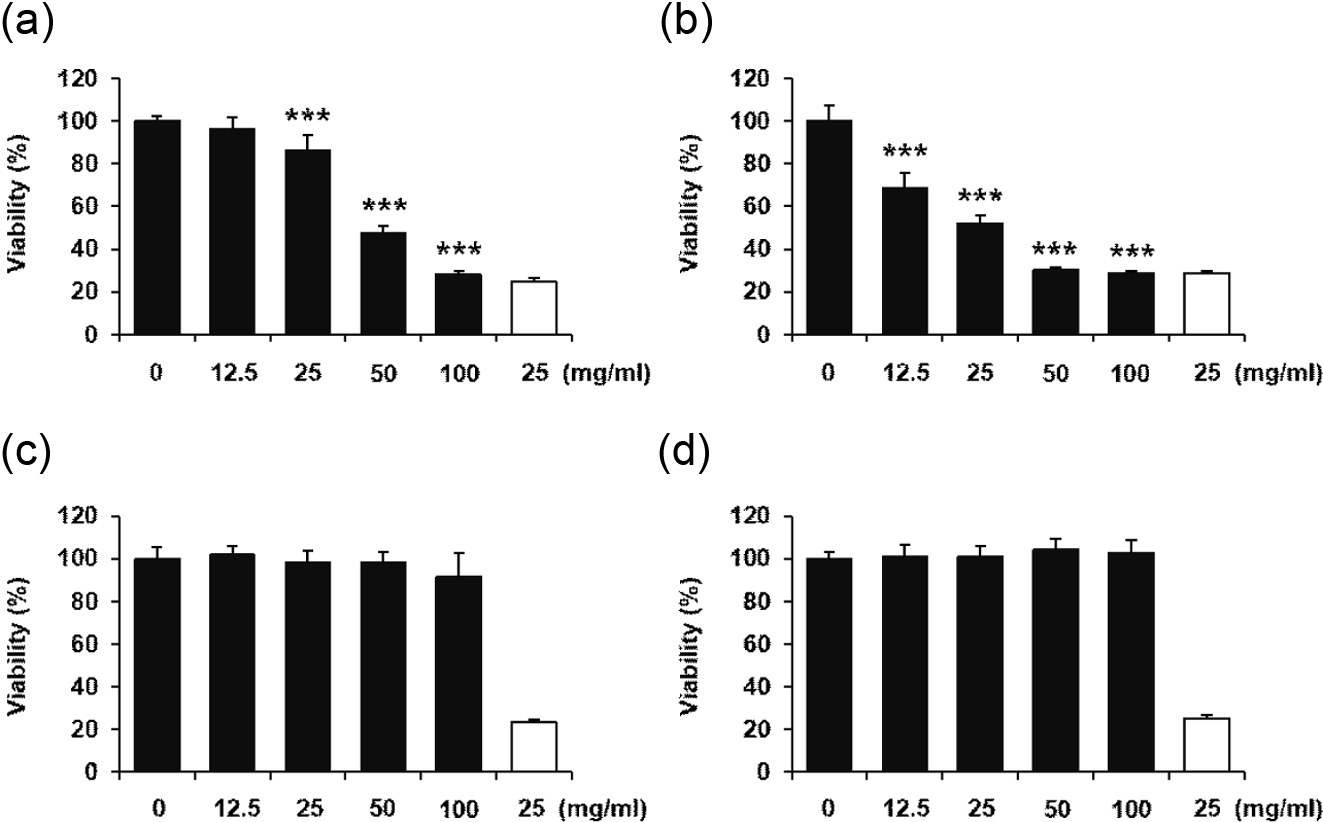 Effect of adhesives on viability in HaCaT cells. (a) Wig-Acryl-I; (b) Wig-Acryl-II; (c) Wig-Silicone-I; (d) Wig-Silicone-II. The results are expressed as mean+SD(n=8) of three separate experiments. ***Significantly different from untreated cells at p < 0.001 (student’s t-test). ■ adhesive; □ positive control.