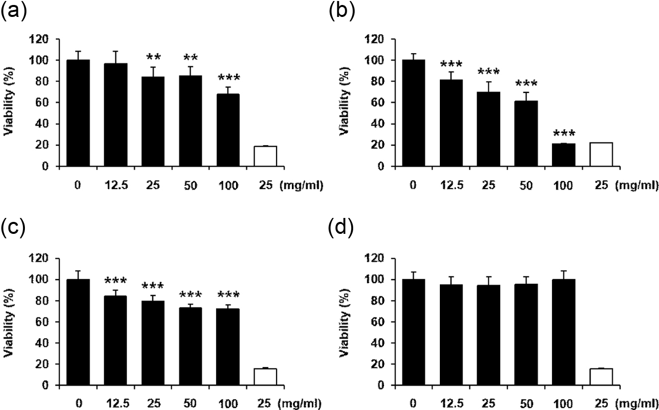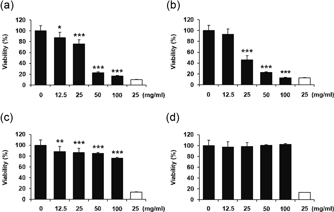 Effect of adhesives on viability in 3T3-L1 cells. (a) Wig-Acryl-I; (b) Wig-Acryl-II; (c) Wig-Silicone-I; (d) Wig-Silicone-II. The results are expressed as mean+SD(n=8) of three separate experiments. *, **, ***Significantly different from untreated cells at p < 0.01, or p < 0.001, respectively(student’s t-test). ■ adhesive; □ positive control.