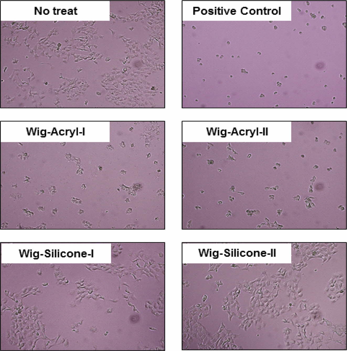 가발접착제 세포독성 평가결과. 4종의 가발접착제에 대한 HepG2 cell의 세포 생존율 분석 결과 아크릴계 가발접착제인 Wig-Acrylic-II 처리에 의해 농도 의존적으로 세포 생존율이 감소되는 것을 확인할 수 있었으며, 다른 3종의 접착제에 의해서는 세포독성이 관찰되지 않았다(Figure 1). NRK52E 셀은 아크릴계 가발접착제인 Wig-Acrylic-I과 Wig-Acrylic-II 처리 그룹에서 농도 의존적 세포 생존율 감소가 관찰되었으며, 두 접착제 모두 100 mg/mL의 농도에서 20% 이하의 생존율을 보였다. 반면, 실리콘계 접착제인 Wig-Silicone-I에 의해서는 유의적인 생존율 감소를 보였지만, 아크릴계 가발접착제와 비교 시 매우 낮은 수준의 세포독성을 나타내었으며, Wig-Silicone-II에 의해서는 생존율 감소가 나타나지 않았다(Figure 2). 3T3-L1 cell을 이용한 세포독성 실험에서는 아크릴계 접착제인 Wig-Acrylic-II 처리에 의해서만 농도의존적인 세포 생존율의 감소가 유발되었으며, Wig-Acrylic-I과 Wig-Silicone-I에 의해서는 처리된 모든 농도에서 유의적인 생존율 감소가 관찰되었지만 Wig-Acrylic-II 처리군에 비해 미약한 수준의 세포독성을 나타내었다. 한편, Wig-Silicone-II에 의해서는 세포독성이 관찰되지 않았다(Figure 3). 피부세포인 HaCaT cell의 경우 신장 상피세포인 NRK52E cell에서 관찰된 세포독성의 양상과 매우 유사한 경향성을 보였다. 즉, 아크릴계 가발접착제인 Wig-Acrylic-I과 Wig-Acrylic-II는 농도 의존적 세포독성을 유발하였으며, 실리콘계 접착제인 Wig-Silicone-I, Wig-Silicone-II에 의해서는 세포독성이 관찰되지 않았다(Figure 4). 가발접착제에 의한 HaCaT cell의 세포독성은 형태학적 변화를 통해 다시 확인하였으며, 그 결과는 Figure 5에 나타내었다. 세포 생존율 결과와 동일하게 아크릴계 가발접착제인 Wig-Acrylic-I과 Wig-Acrylic-II는 실리콘계 가발접착제인 Wig-Silicone-I와 Wig-Silicone-II 처리 그룹보다 현저한 세포독성이 일어나는 것을 확인할 수 있었다.