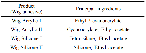 가발접착제 선정. 국내에서 사용되고 있는 가발접착제 중에서 사용량이 많은 아크릴계 접착제 2종과 실리콘계 접착제 2종을 각각 분석 대상으로 선정하였으며, 그 주요 성분은 Table 1에 제시하였다.