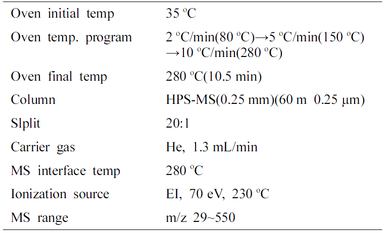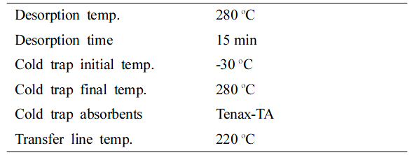 벤젠류의 성분 분석은 샘플링 백 내 공기를 채취한 Tenax tube을 280 oC로 가열 탈착하여, 가열하는 동안 저온 농축관의 온도는 최소 -30 oC 이하로 유지 되어야 하며 가열-탈착이 끝나는 대로 저온 농축관을 가능한 빠르게 승온시켜 280 oC에서 5분 이상 2단 열탈착(TD, thermal desorber)을 실시한다. 열탈착 분석 조건은 Table 2에 나타내었다. 저온 농축관의 2단 열탈착이 개시됨과 동시에 GC/MSD(gas chromatography/ mass spectrometer detector)의 분석조건(Table 3)을 기본으로 각각의 기기의 상태를 고려하여 동등한 결과를 낼 수 있는 범위 내에서 분석 조건으로 실험을 진행하였다.17