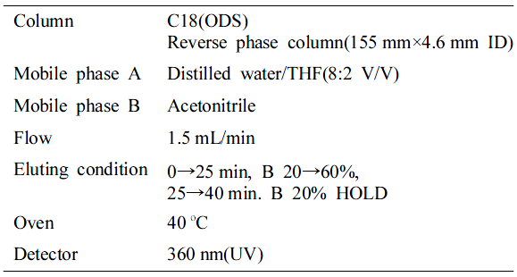 알데히드류 분석방법은 샘플 채취한 dinitrophenyl hydrazine 카트리지에 5 mL의 acetonitrile을 주입하여 흡착된 알데히드를 용출시킨다. 시료의 오염을 막기 위해 이때 사용하는 모든 기구는 acetonitrile로 세척한 후 건조시켜 사용한다. 용출액 1.5 mL를 2 mL 바이알에 넣고 HPLC(high-performance liquid chromatography)의 auto sampler에 장착한 후, 표준 분석조건(Table 4)을 참고하여 분석을 진행하였다.18