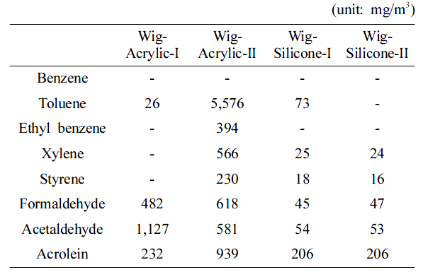 아크릴계 가발접착제와 실리콘계 가발접착제 VOCs 분석을 통해 아크릴계 가발접착제의 위해성이 더 높음을 확인할 수 있었고, 특히 Wig-Acrylic-II 접착제의 경우는 VOCs 방출량이 기준치를 상회하는 높은 방출 값을 보여 제품 사용에 대한 추가적인 안전성 평가가 있어야 할 것으로 판단된다.