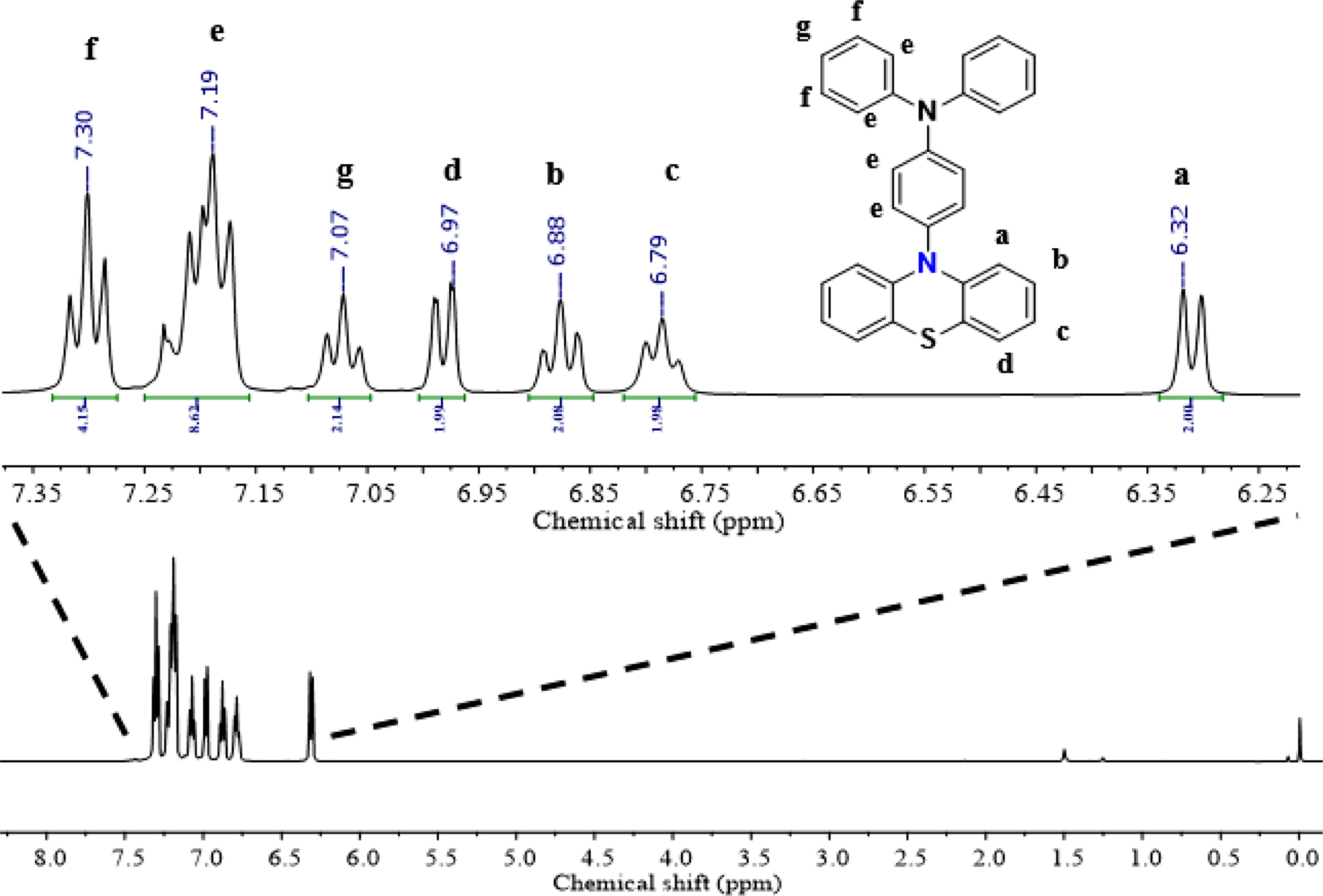 The chemical structure of PDPA was analyzed via 1H NMR spectrum in Figure 1. The data showed that 1H NMR spectrum of PDPA exhibited fully characteristic peaks of PDPA including peaks of phenolthiazine and triphenylamine. The peaks at 7.31 ppm (peak “f”, triplet), 7.19 ppm (peak “e”, quart) and 7.08 ppm (peak “g”, triplet) are corresponding to the protons of triphenylamine moieties. The peaks at 7.00 ppm (peak “d”, doublet), 6.88 ppm (peak “b”, triplet), 6.79 ppm (peak “c”, triplet) and 6.31 ppm (peak “a”, doublet) were assigned to the protons of phenolthiazine ring. Based on the characteristic peaks and reasonable their integration, the obtained product has been concluded that PDPA was synthesized successfully.
