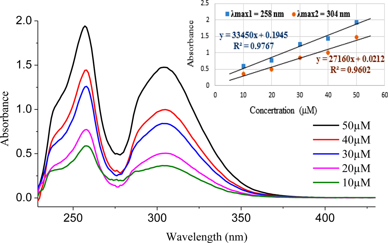 The UV-Vis spectrum of PDPA was measured in different concentrations of THF with different concentrations in Figure 2. The absorbed curves exhibited two distinct absorption peaks at 258 and 306 nm which corresponding to the absorption of triphenylamine moieties and phenolthiazine, respectively. Moreover, the spectra showed a linear correlation between concentration and absorbance, and the molar extinction coefficient was determined through the Lambert – Beer law. The first absorption peak at 259 nm presents an extinction coefficient value of e (33790 M−1cm−1) and the peak at 306 nm shows a extinction coefficient of e (27150 M−1cm−1). These results suggested that PDPA catalyst has the absorption maxima in the UV regime.