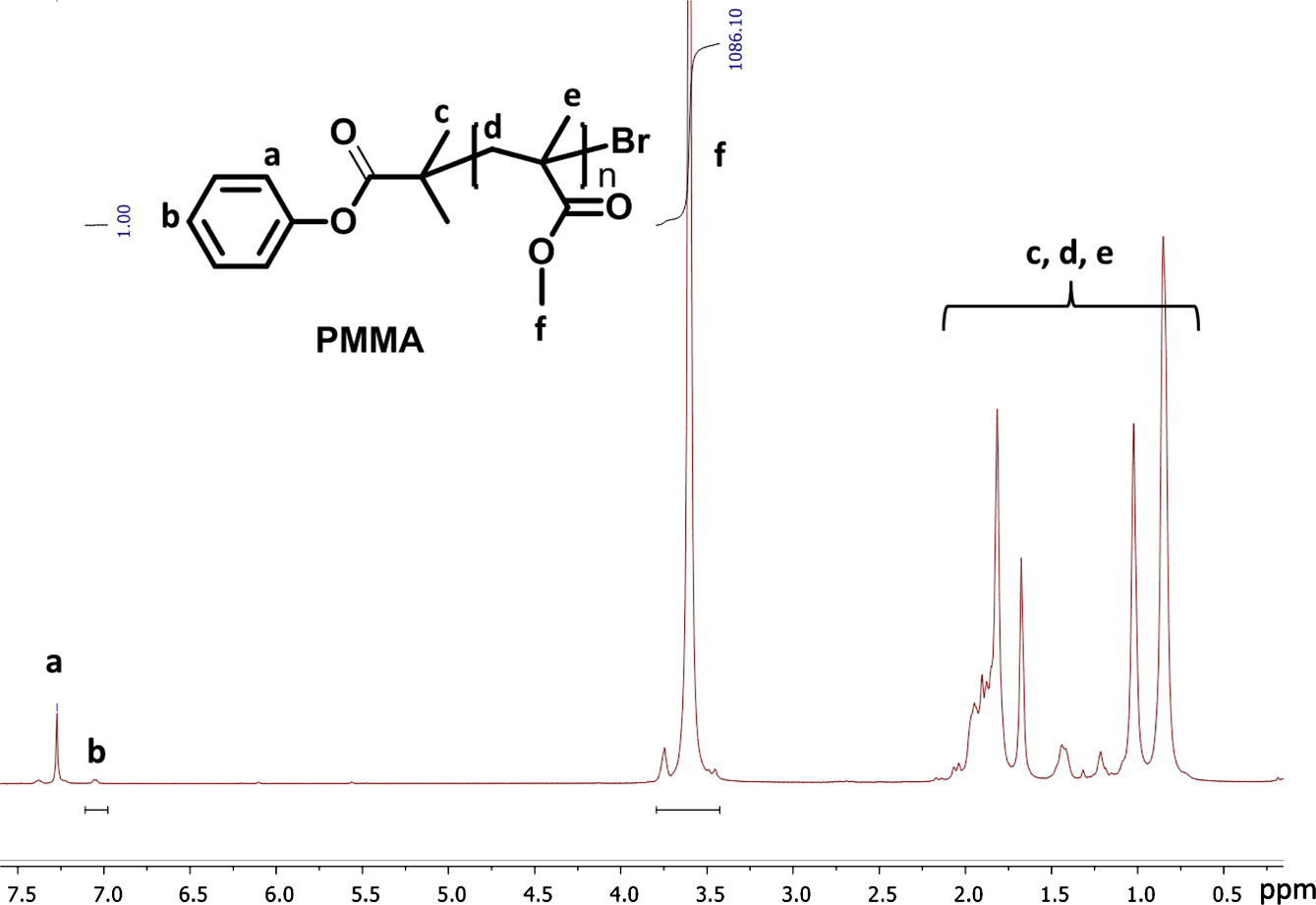 In addition, the obtained PMMA was characterized via 1H NMR in Figure 3 to determine the structure of obtained PMMA as well as the absolute molecular weight. Based on the integration ratio of characteristic peaks of PMMA in 1H NMR spectrum, the molecular weight of PMMA was determined about 10800 g/mol.
