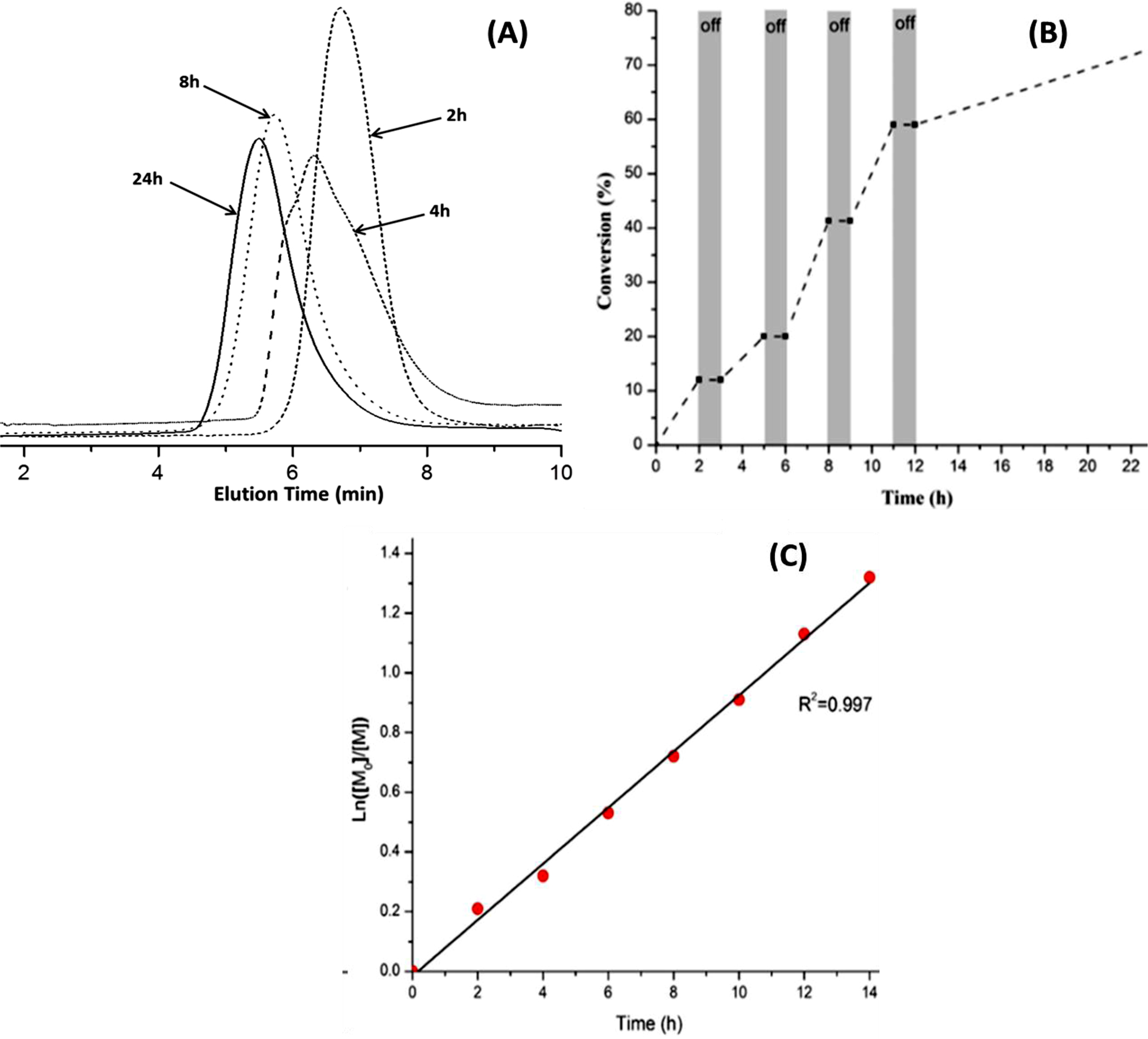 (A) GPC trace of obtained PMMA vs. time reaction. (B) Plot of MMA monomer conversion vs. time demonstrating the control over polymerization propagation through the “on/off” light irradiation experiment. (C) Semilogarithmic kinetic plots of polymerization.