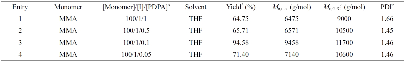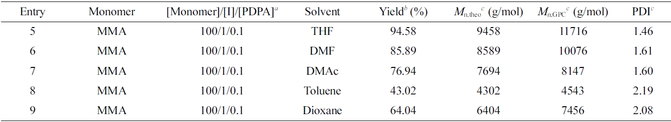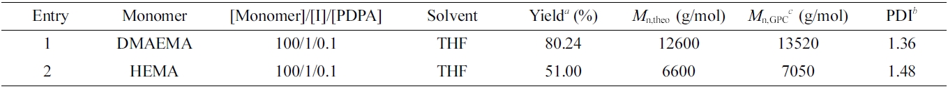 To expand this polymerization system to other methacrylate monomers, the polymerizations of DMAEMA and HEMA were investigated (Table 3). All reactions using a ratio of [Monomer]/[I]/[PDPA] = 100/1/0.1 were performed in THF under UV light irradiation. As a result, the polymerization of DMAEMA monomer gave the high yield of 80.24% and low polydispersity index of 1.36. In the case of HEMA monomer, the yield of polymerization was determined 51% with polydispersity index of 1.48. It can be recognized that the polymerization performance is not only depend on the solvent but also the natural monomers.
