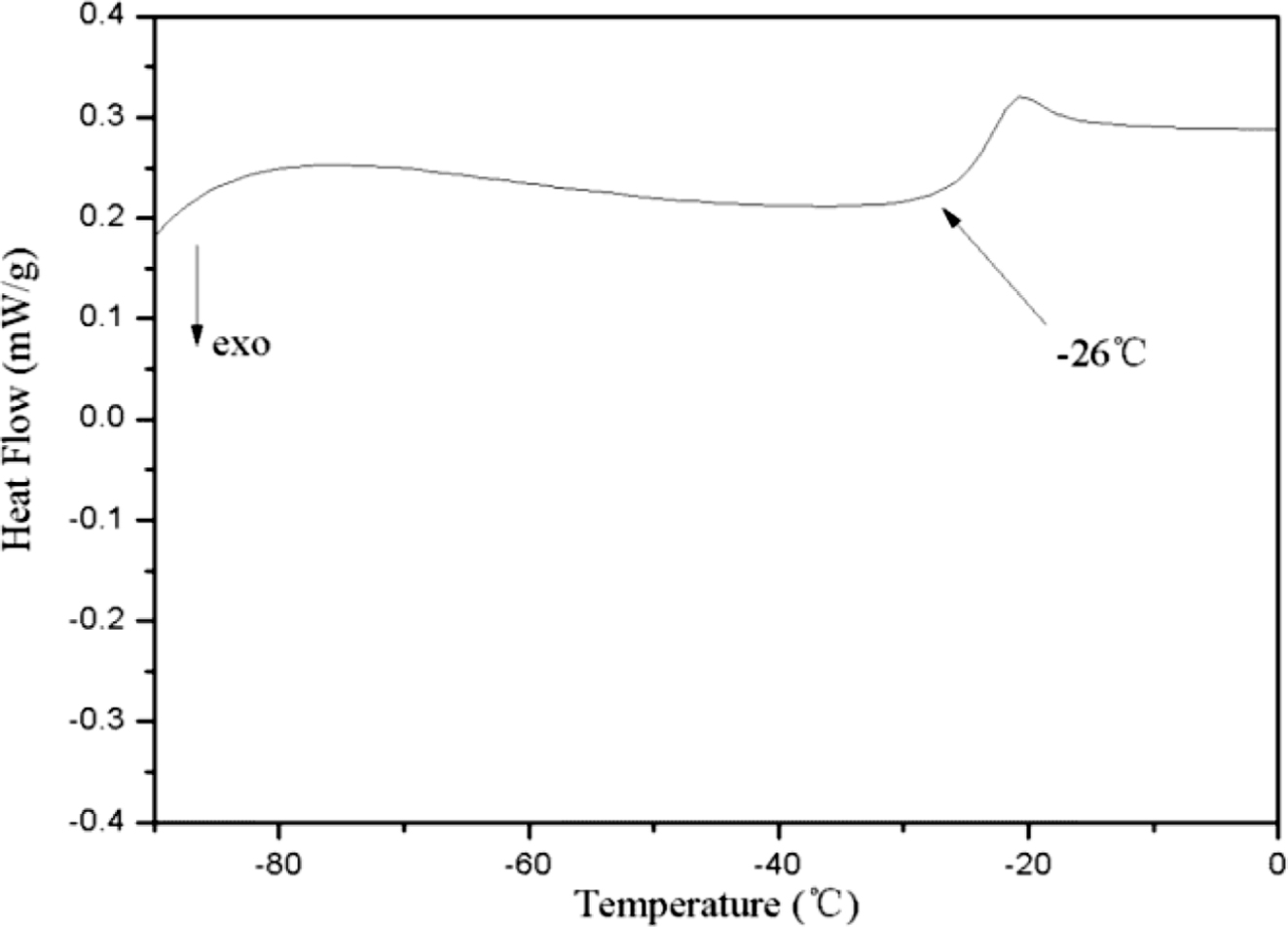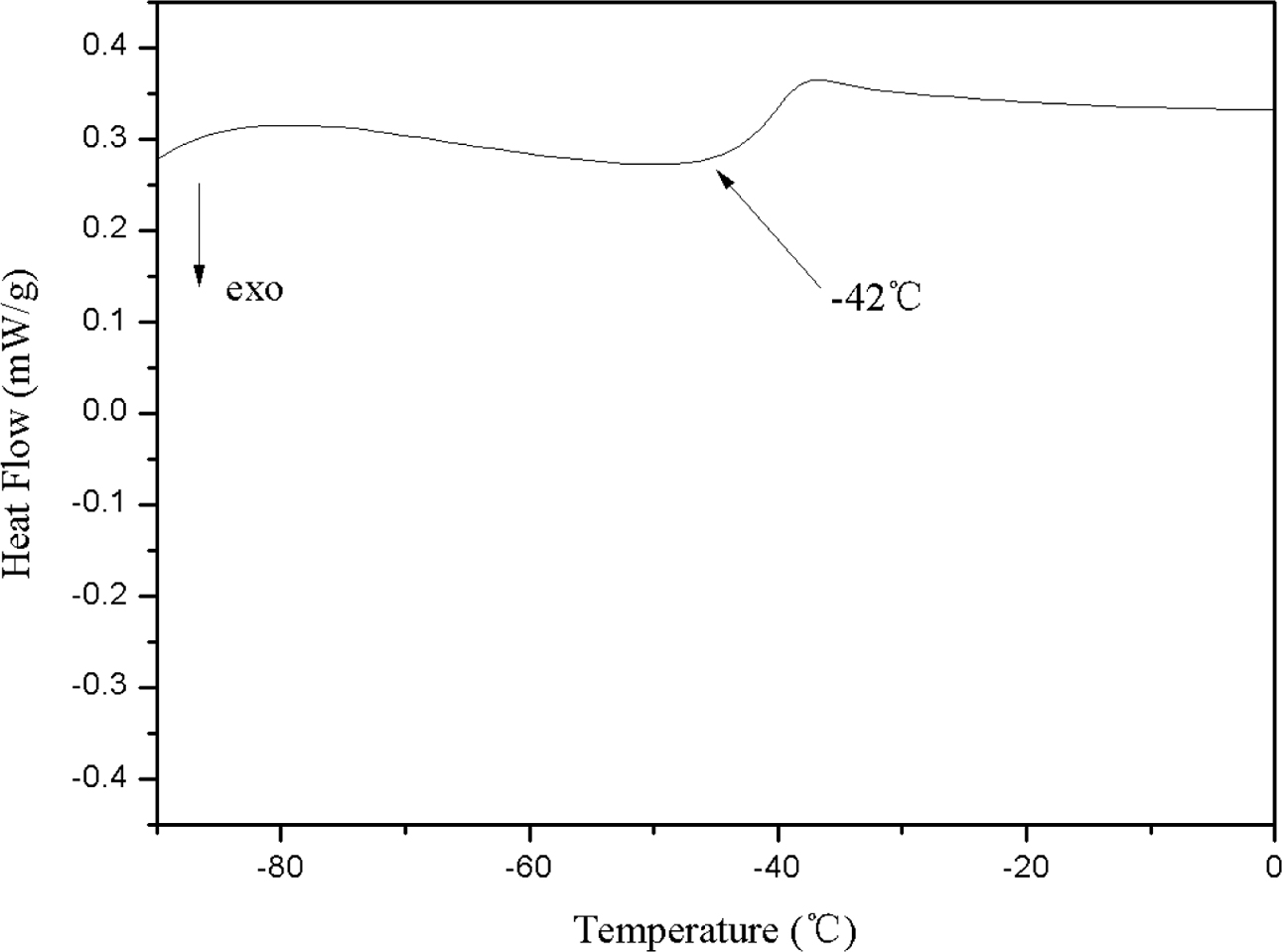 Thermal Properties of AUT-PNIMMO. Figure 8 shows the Tg curve of AUT-PNIMMO. The Tg value (-26 ℃) of AUT-PNIMMO is higher than T-PNIMMO (-42 ℃). Furthermore, AUT-PNIMMO has a single Tg. The single Tg of AUT-PNIMMO indicates that it is a single polymer.39