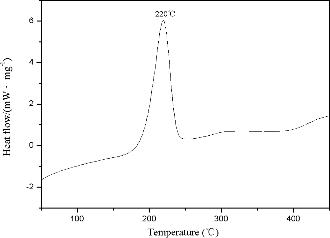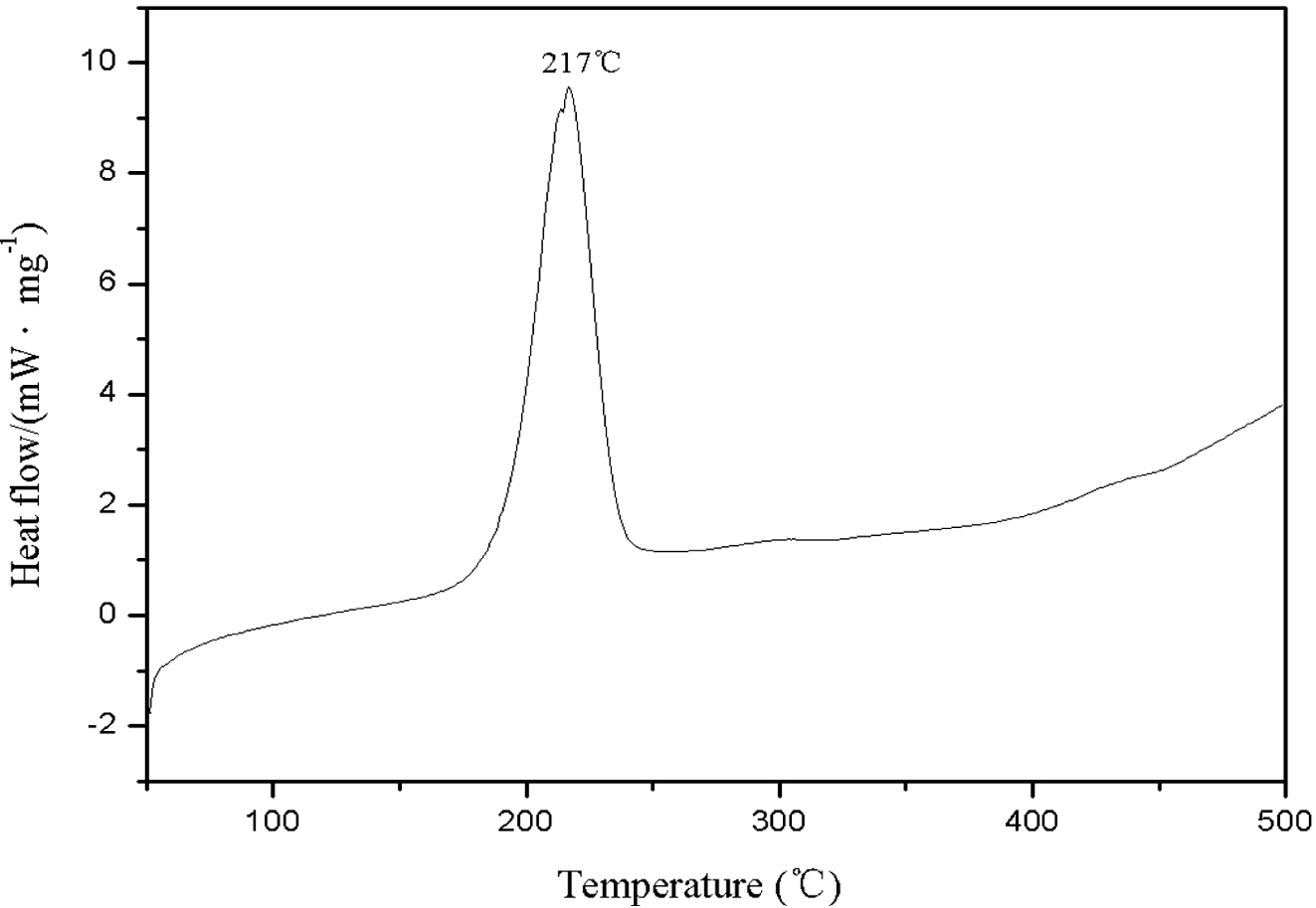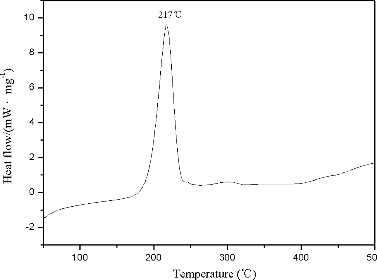 Figure 9 shows the DSC curve of AUT-PNIMMO. As can be seen, an exothermic decomposition peak is observed around 217 ℃ corresponding to degradation of –ONO2 energetic segment. This is similar with the DSC curve of T-PNIMMO and indicates that AUT-PNIMMO has thermal stability.