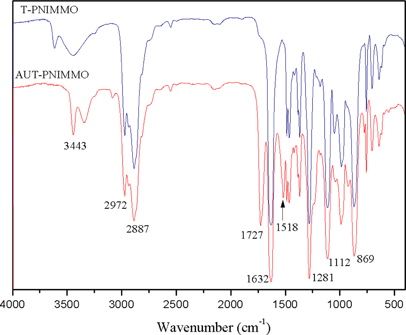 Structure of AUT-PNIMMO. Figure 5 shows the FTIR spectra of T-PNIMMO and AUT-PNIMMO. In the FTIR spectrum of the AUT-PNIMMO, the stretching vibration of N-H was observed at 3443 cm-1. The in-plane bending vibration of N-H was observed at 1518 cm-1. The peak at 1727 cm-1 is attributed to stretching vibration of C=O.36,37 The FTIR spectrum of AUT-PNIMMO shows same characteristic peaks of T-PNIMMO at 2887, 1632, and 1281 cm-1.