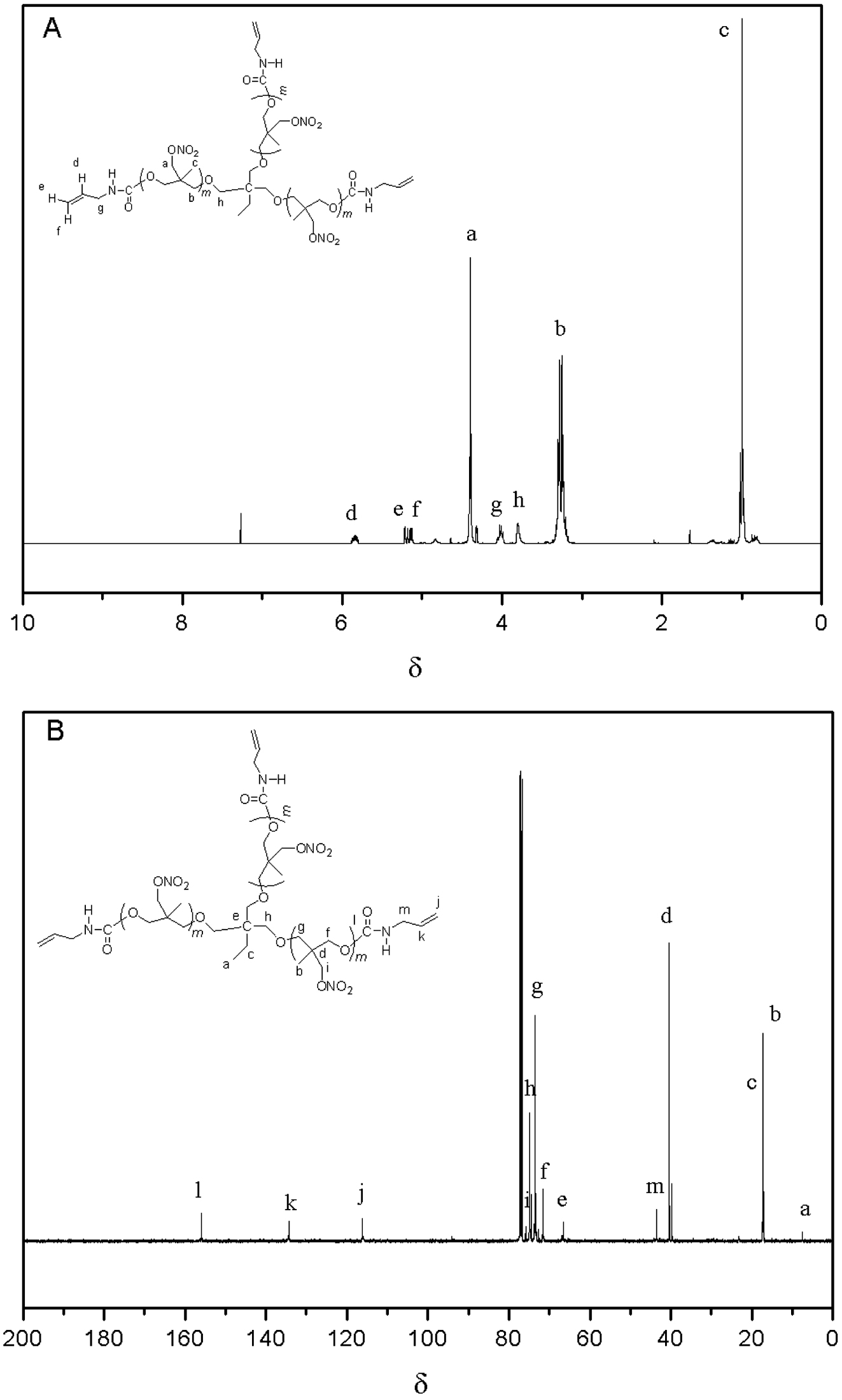 The structures of AUT-PNIMMO were characterized by 1H NMR and 13C NMR as presented in Figure 6. As shown in Figure 6(A), the signals observed at 0.96-1.00 ppm were attributed to the methyl protons (denoted c) of the side chain. The signals at 3.25-3.28 ppm were due to the methylene protons (denoted b) of the main chain. The signals at 4.39 ppm were attributed to the methylene protons (denoted a) of the side chain. The signals at 5.85, 5.24, and 5.13 ppm were due to the alkenyl protons (denoted d, e and f) of the main chain. The signals at 4.01 and 3.80 ppm were due to the methylene protons (denoted g, h) of the main chain. The reaction was also confirmed by 13C NMR spectrum. As shown in Figure 6(B), the resonances of carbons are similar with T-PNIMMO. The difference is shown as follows. The resonances of alkenyl carbons (denoted j, k) in the main chain were presented at 116.3 and 134.3 ppm. The resonances of carbonyl carbons (denoted l) in the main chain were presented at 155.9 ppm. The resonances of methylene carbons (denoted m) in the main chain were presented at 43.5 ppm.38