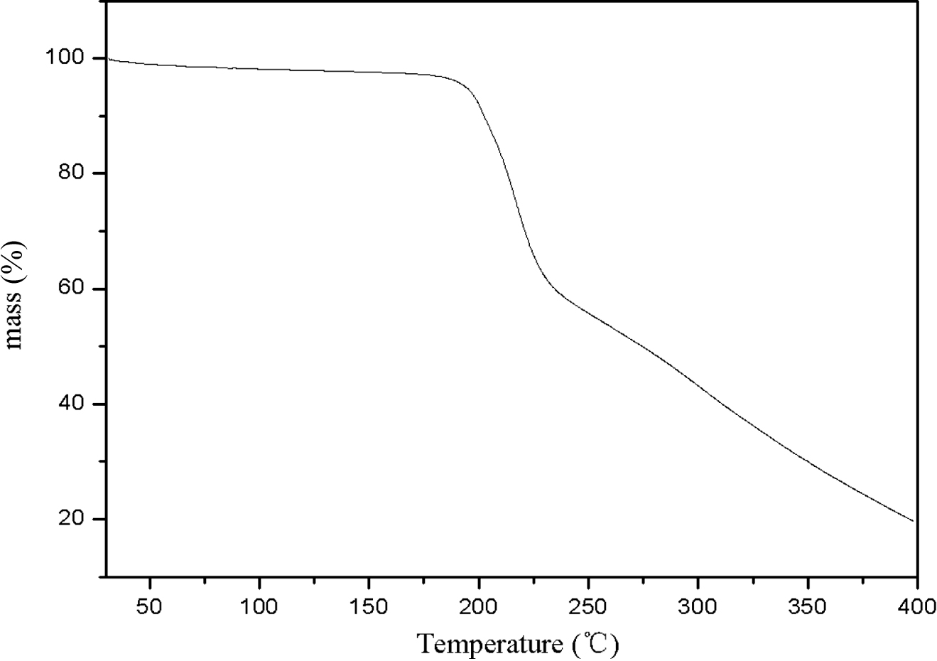 Residual solvent in the elastomer is expected to affect their physical properties. The TGA curve is used to prove that there is no residual solvent in the isoxazoline elastomer obtained after curing. The TGA curve of the isoxazoline elastomer is shown in Figure 11. The TGA thermogram displays two distinct regions of weight loss. The first weight loss temperature occurred at 220 ℃ with a sharp weight loss of around 40% with respect to the total, corresponding to the decomposition of –ONO2 energetic segment. The second main weight loss occurred at 240-400 ℃ with a gradual weight loss was due to the main-chain thermal decomposition of the isoxazoline elastomer.