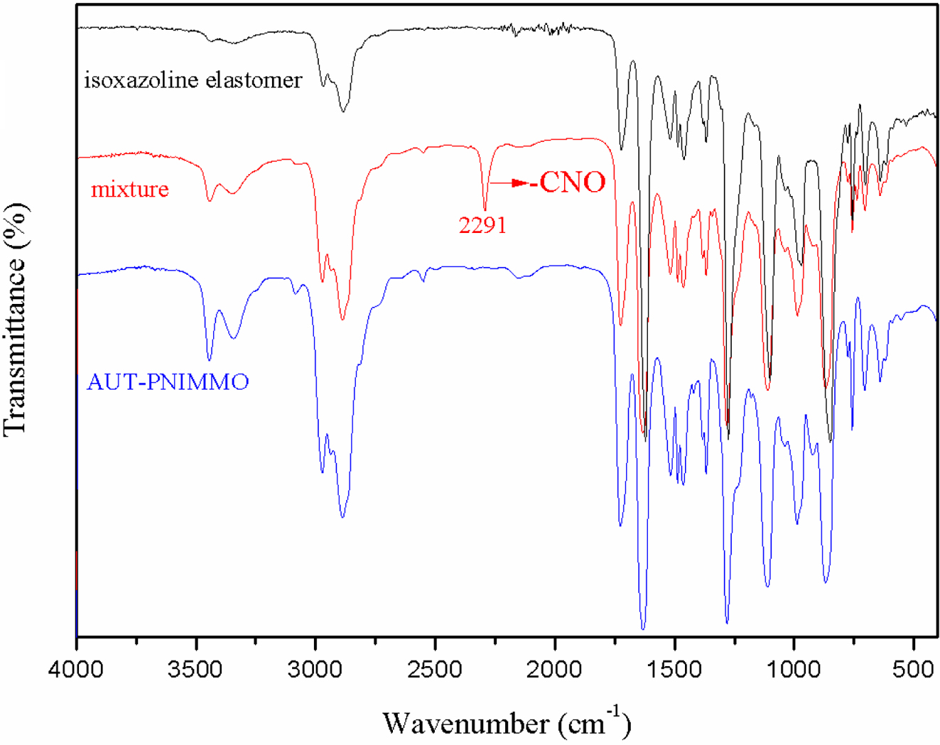 The FTIR spectra of the mixture of AUT-PNIMMO and TTNO, isoxazoline elastomer and AUT-PNIMMO are shown in Figure 12. Comparison of the spectra shows that the disappearance of strong absorption peak (2291 cm-1) of –CNO indicates the completion of 1,3-dipolar cycloaddition reaction. There are three C=C bonds in each AUT-PNIMMO molecule and two –CNO groups in each TTNO molecule. The –CNO group of TTNO reacts with C=C bond of AUT-PNIMMO to form the isoxazoline. As a result, the FTIR absorption peak of –CNO group disappeared. These can confirm successful progress of the reaction of nitrile oxides with vinyl end groups in AUT-PNIMMO.