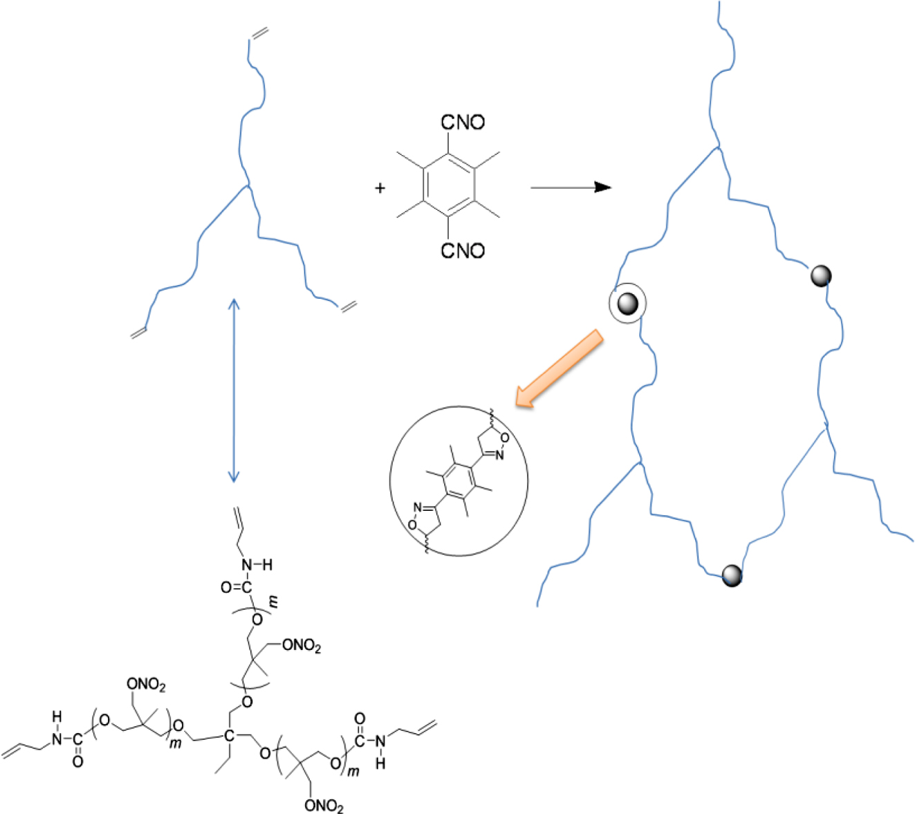 Hydroxyl-terminated polybutadiene (HTPB) has been used in composite solid propellant and polymer bonded explosives for a very long time for binding the oxidizer, metallic fuel, and other additives.1-4 In recent years, the replacement of HTPB by energetic polymeric binders such as glycidyl azide polymer (GAP) and poly(3-nitratomethyl-3-methyloxetane) (polyNIMMO) to develop advanced rocket propellants is a new trend in the field of energetic materials. They are usually cross-linked by the curing agent of isocyanate to form polyurethanes.5-9 However, the reaction of hydroxyl terminated prepolymers with the isocyanates suffers from the humidity sensitivity in the curing process.10-13 Furthermore, the curing of isocyanate system needs high temperature.