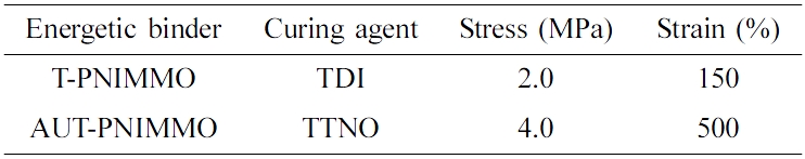AUT-PNIMMO was synthesized by T-PNIMMO and allyl isocyanate to produce a material for energetic binder for polymer bonded explosives and solid rocket propellant. T-PNIMMO with three functional groups was synthesized by cationic ring opening polymerization of 3-nitratomethyl-3-methyloxetane (NIMMO) in the presence of trimethylolpropane (TMP) catalyzed by BF3·OEt2. The structures of these compounds were confirmed by FTIR, 1H NMR, 13C NMR, and their thermal stability was estimated by DSC. Tensile testing evaluated the ultimate mechanical properties of polyurethane elastomer based on T-PNIMMO and TDI and isoxazoline elastomer based on AUT-PNIMMO and TTNO. That showed an increase of tensile strength from 2.0 to 4.0 MPa and elongation at break from 150% to 500%, respectively. These results indicated that AUT-PNIMMO exhibited a good thermal stability, and was expected to be used in the composite solid propellant and polymer bonded explosives.