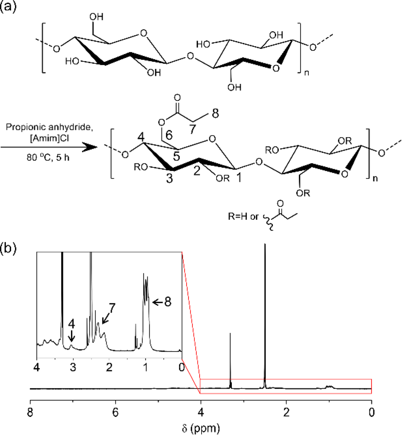 Figure 1 (a) Reaction scheme to prepare cellulose propionate; (b) representative 1H NMR spectrum of cellulose propionate. |