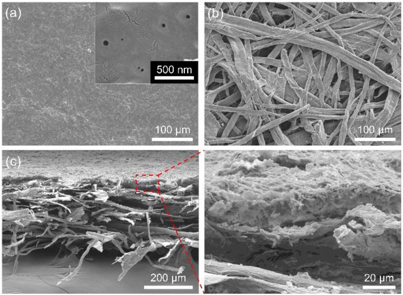 Figure 2 FE-SEM images of the cellulose propionate (CP) membrane. (a) Top; (b) bottom surface of the CP membrane; (c) crosssectional image of the membrane (left) and zoomed-in image of the |