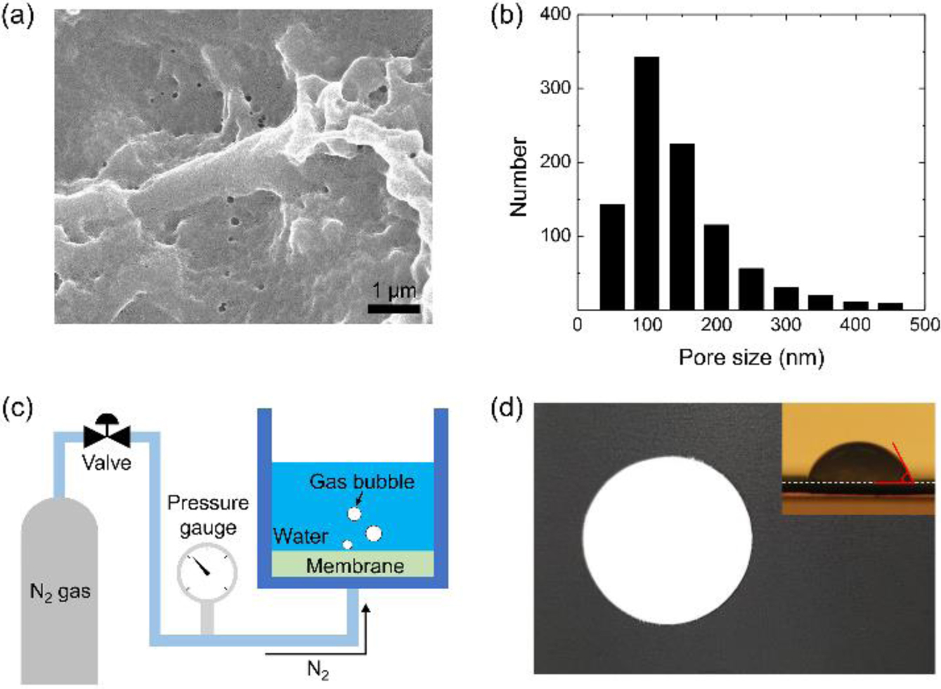 복합여과막의 기공 크기를 좀 더 정밀하게 분석하기 위해 추가적인 표면 관찰과 bubble point test를 진행하였다. FE-SEM을 통해 확인한 결과, 기공막의 전 면적에 평균 0.15± 0.13 μm 직경의 기공들이 형성되어 있었고, 비교적 좁은 크기 분포를 보였다(Figure 3(a) and 3(b)). 막에 비정상적인 크기의 기공이 있을 경우, 입자 제거효율에 큰 영향을 미칠 수 있기 때문에 bubble point test로 막의 균일성을 확인하였다. Bubble point test는 표면장력에 의해 기공에 유지되고 있는 액체를 기공 밖으로 밀어내기 위한 압력을 측정하여 기공의 크기를 계산하는 방법이다. Figure 3(c)와 같은 실험장치를 이용해 CP 여과막의 bubble point를 측정하였을 때, 0.23 bar에서 최초로 bubble이 발생하는 것을 확인하였다. Figure 3(d)에서 보는 바와 같이, CP 여과막의 물에 대한 접촉각이 약 60o인 것을 감안할 때, 여과막 내 최대 기공크기는 약 0.6 μm임을 알 수 있다(식 (1)). 결국, 상반전법으로 제조된 CP 복합막은 수백 나노미터의 직경을 가지는 기공이 전면적에 비교적 균일하게 형성되어 있고, 2.5 μm 이하의 크기를 갖는 초미세먼지용 필터로 활용 가능성이 있을 것으로 예상된다.