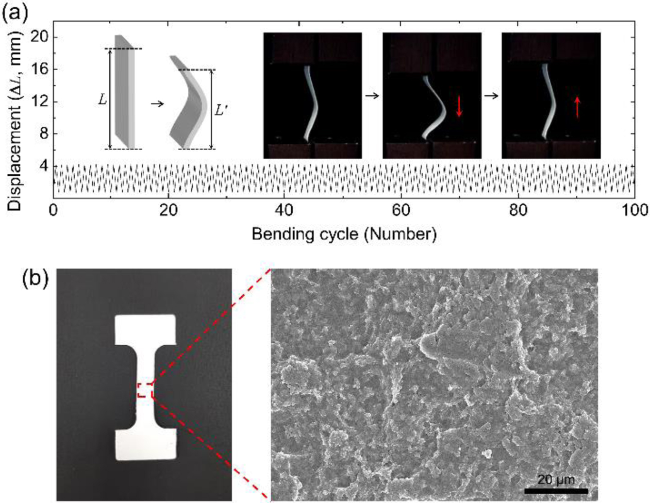 Figure 4 (a) Displacement profiles obtained from cyclic bending tests with the CP composite membrane (n>100). Photographs show the procedure of a bending cycle; (b) a photograph and SEM image |