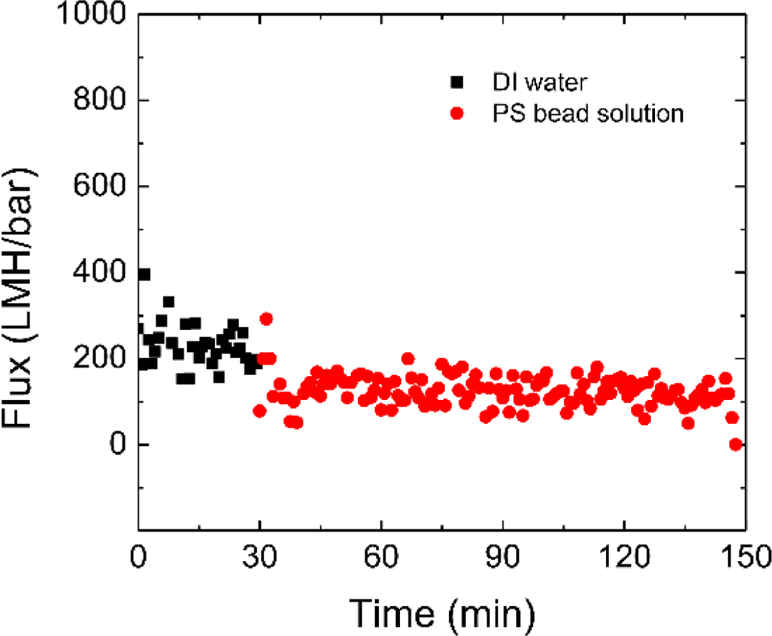 Figure 5 Permeability tests of DI water and PS beads solutions with CP composite membranes operated in the dead-end filtration mode. |
