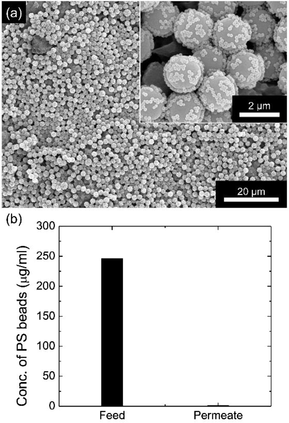 Figure 6 (a) SEM images showing PS beads blocked on the CP composite membrane after filtration tests; (b) fluorescence of PS beads measured in feed and permeate solutions. |