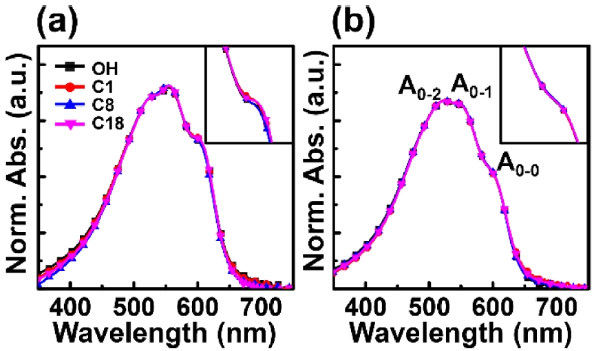 이용하여 전계효과 이동도를 계산해냈다.24,25 OH 기판을 사용한 P3HT 박막의 경우 CB, CF 용매에서 각각 4.58×10-4, 3.92×10-4 cm2/Vs의 매우 낮은 전하 이동도를 보였다. 이후 C1, C8 표면처리를 통하여 전하 이동도가 점차 증가함을 보였으며, C18 표면처리된 절연체를 이용한 경우, CB, CF 용매에서 각각 4.15×10-2, 1.44×10-2 cm2/Vs으로 기존 OH의 기판에 비해 약 90배, 36배 향상됨을 확인하였다(Figure 6(c), Table 2).