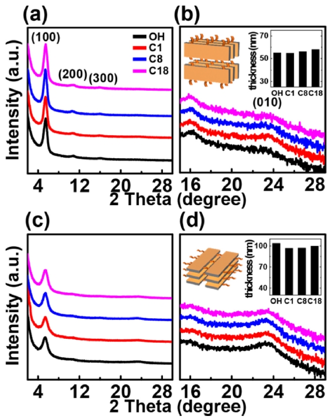 Figure 3 Figure 3. XRD patterns of P3HT films spin-cast using (a) CB; (c)CF on four kinds of substrate. Magnified XRD intensities of (010)peaks using (b) CB; (d) CF. The inset shows schematic of face-onand edge on structure of P3HT films (left) and the thickness ofP3HT thin films with different substrate (right). |