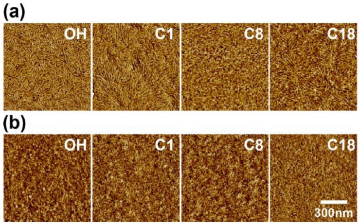 4종류의 서로 다른 표면특성을 가지는 SiO2 기판 위에 스핀코팅된 P3HT 박막의 표면 모폴로지를 AFM을 이용하여 분석하였다(Figure 4). 먼저 CB를 사용하여 제조된 P3HT 박막의 경우에 두껍고 긴 형태의 nanofibril을 가지는 모폴로지를 확인하였다. 이는 CB 용매의 높은 끓는점으로 인하여 박막형성 시 증발 속도가 느려져 P3HT 분자들의 상호인력이 향상된 것으로 보인다(Figure 3(a)). CF를 사용하여 제조된 P3HT 박막은 용매의 낮은 끓는점으로 인하여 nanofibril이 짧고 얇은 형태의 모폴로지를 나타내었다.22,23 하지만, 기판의 표면특성에 따른 모폴로지 차이는 미비하여 UV-Vis와 XRD 결과와 마찬가지로 기판특성에 따른 P3HT 박막의 구조적인 변화는 없었다.