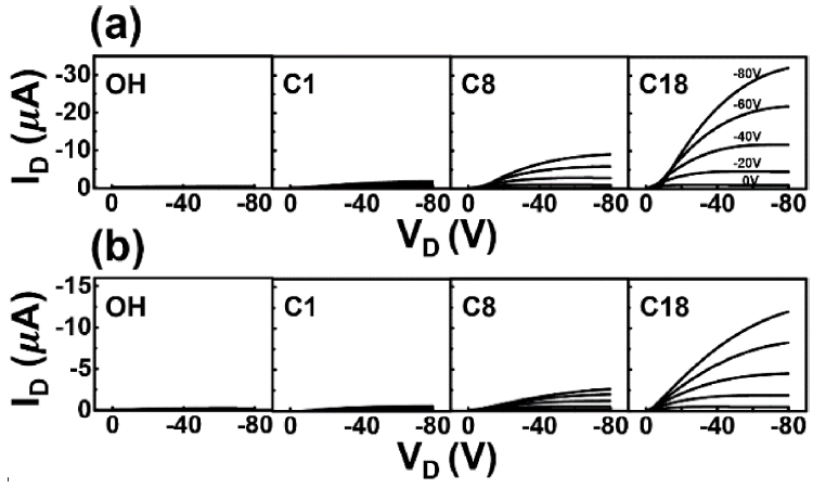 P3HT 소자 특성 분석. 절연층의 표면특성과 주용매에 따른 P3HT 박막의 전기적 특성 변화를 살펴보기 위하여 트랜지스터 소자를 제조해 I-V 특성을 조사하였다. 게이트를 0에서 -80 V까지 -20 V 간격으로 변화시키며 소자의 출력 (output) 특성을 측정하였다(Figure 5). 이때 기판이 친수성인 OH에서 C1, C8, C18로 알킬사슬 길이가 길어질수록 전하가 원활히 이동하여 높은 드레인 전류가 흐르는 것을 보이는 것을 확인할 수 있었다. 이는 CB와 CF를 이용한 고분자 박막 모두 동일하게 나타났다. Figure 6(a), (b)는 게이트 전극에 전압을 +80 ~ -80 V로 sweep하여 트랜지스터의 전달(transfer) 곡선을 측정하였고 식 (2)를
