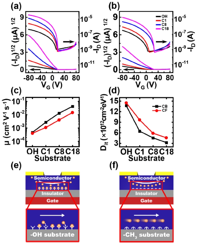 Figure 6 Figure 6. Transfer characteristic (Id-Vg) of transistors (VD=-80V)fabricated with P3HT thin films spin-cast using (a) CB; (b) CF ondifferent substrate. (c) Field-effect mobilities (μ); (d) Interface trapdensities (Dit) calculated from the P3HT transistors. Schematic ofcharge transport process at the interface between semiconductorlayer and insulator layer (e) OH substrates; (f) surface treatmentsubstrates. |