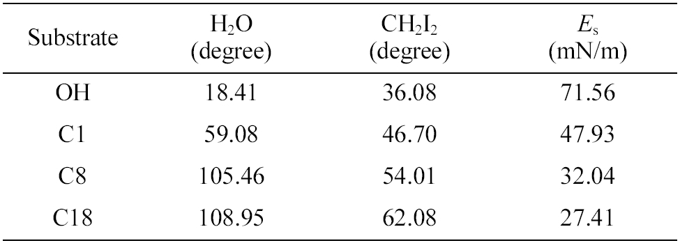 Table 1 Table 1. Contact Angles for Water and CH2I2 on Four Kindsof Substrates and Surface Energy Calculated from ContactAngles |