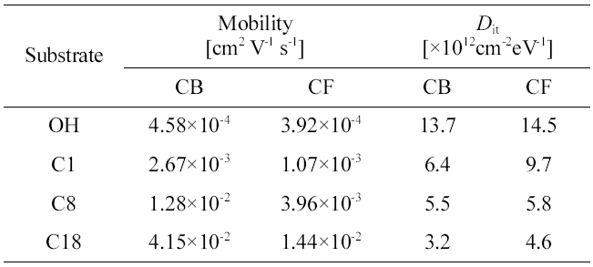 계면에서의 트랩밀도는 표면처리에 사용한 자기조립 단분자막의 알킬사슬 길이가 길어질수록 감소하는 경향을 보였다 (Figure 6(d), Table 2). 이는 자기조립 단분자막의 알킬사슬길이가 길수록 더 큰 van der Waals 인력이 작용하여 SiO2 표면을 더욱 조밀하게 소수성으로 표면개질되었기 때문이다. 이는 앞선 출력곡선과 동일한 결과로써 CH3의 작용기를 가진 표면처리가 전하 수송을 방해하는 전하트랩 밀도를 효과적으로 감소시킨 것을 확인하였다(Figure 6(e), (f)). 또한 CB를 주용매로 사용하였을 경우에는 P3HT 박막이 높은 결정성을 가지므로 박막 내부의 전하트랩 또한 효과적으로 줄어들어 CF보다 더 낮은 전하트랩 밀도 값을 가지는 것을 확인하였다(Table 2).
