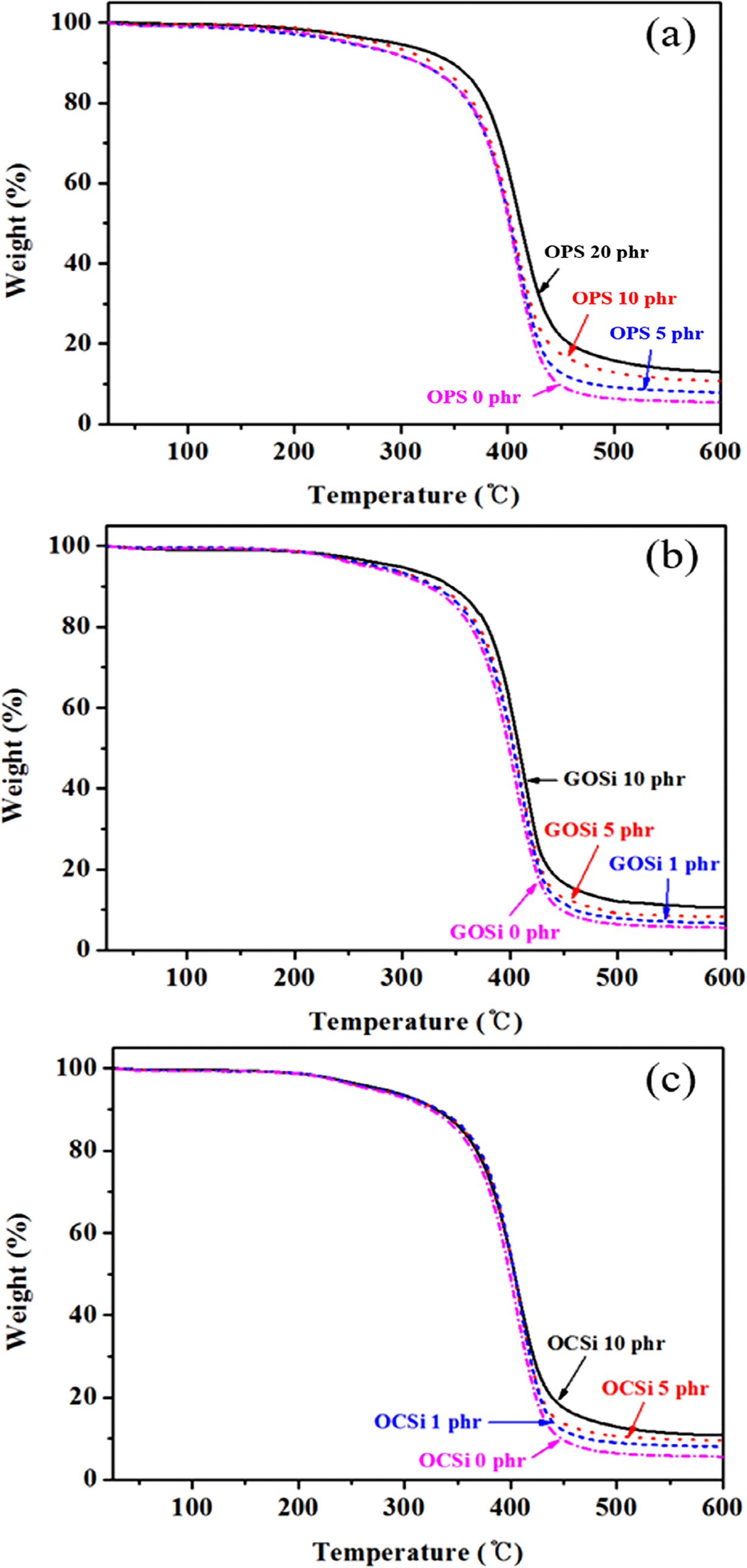 Figure 4. TGA thermograms of various PSAs depending on crosslinker: (a) OPS; (b) GOSi; (c) OCSi.