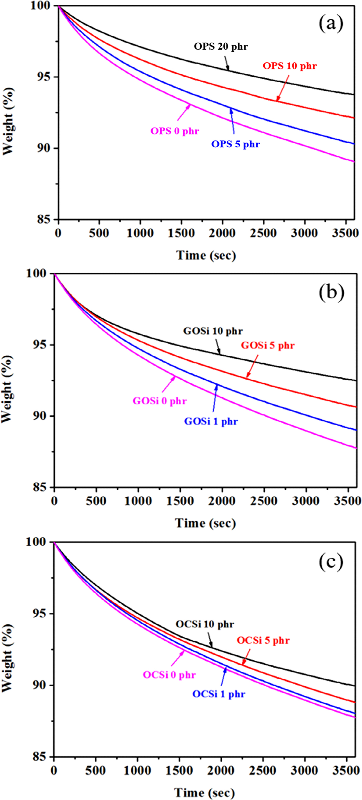 Figure 5. TGA thermograms of various PSAs depending on crosslinker at 250 oC isothermal condition for 1 h: (a) OPS; (b) GOSi; (c) OCSi.