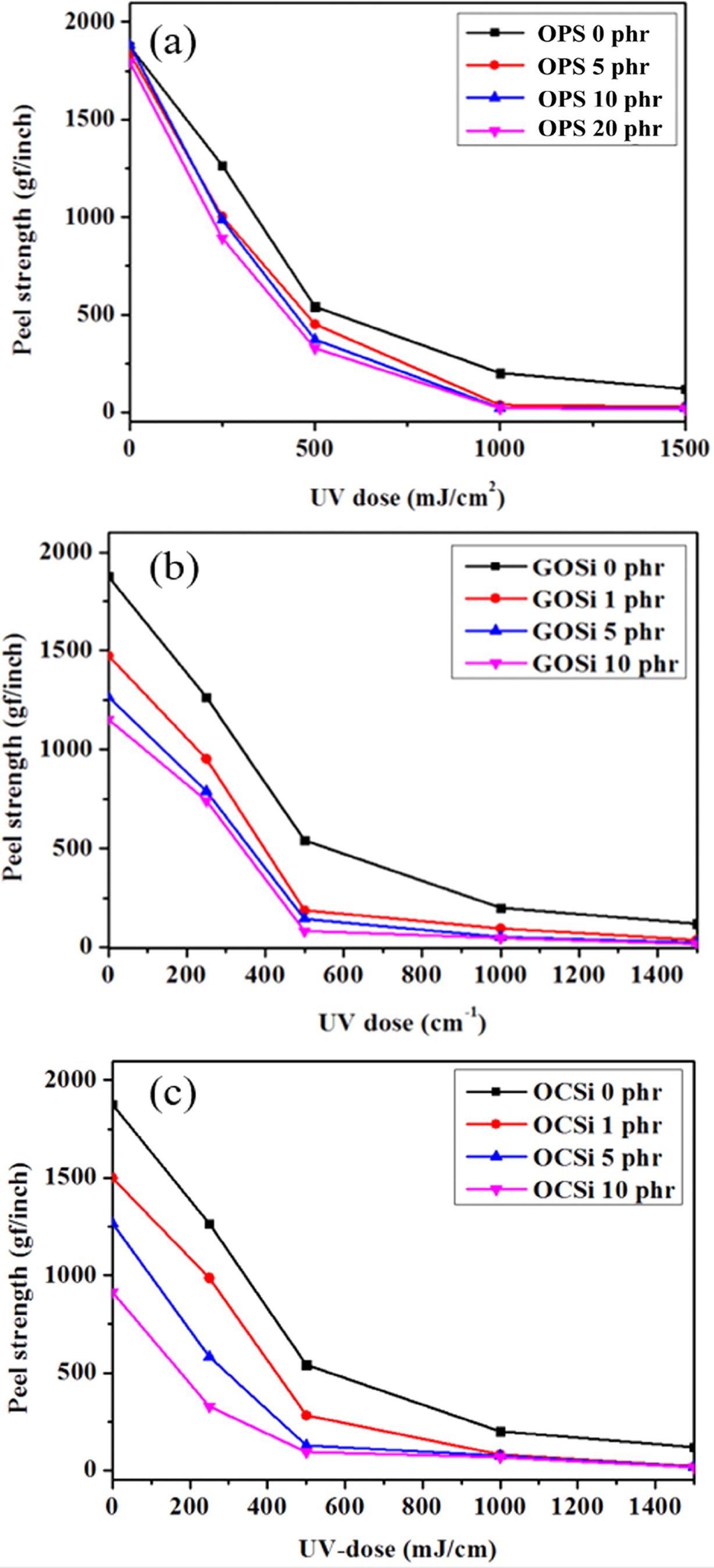 Figure 6. Peel strength of various PSAs depending on crosslinker: (a) OPS; (b) GOSi; (c) OCSi.