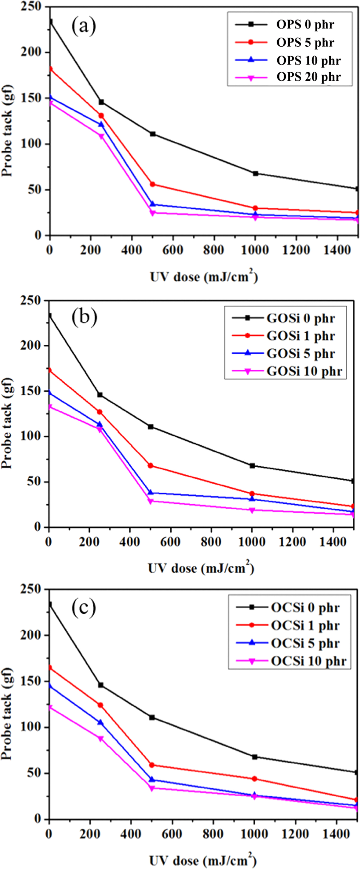 Figure 7. Probe tack of various PSAs depending on crosslinker: (a) OPS; (b) GOSi; (c) OCSi.