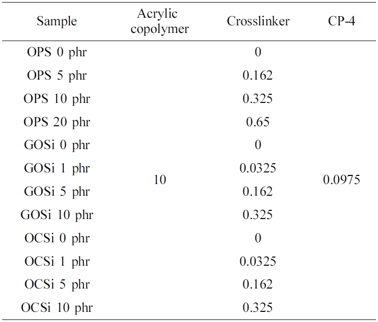 OCNT/siloxane(OCSi) 및 GO/siloxane(GOSi) 나노복합가교제 제조를 위하여 에탄올과 탈이온수의 질량비를 8 : 2로 하여 염산을 적하시켜 pH를 4.0으로 맞춘 후 TMSPM 1.0 g을 첨가하여 25 oC에서 30분 동안 교반시켜 주었다. 이 혼합물에 OCNT 및 GO를 각각 0.5 g을 투입하여 1시간 동안 초음파 분산시키고 60oC를 유지하여 4시간 동안 교반하며 TMSPM의 가수분해 반응을 진행하였다. TMSPM의 가수분해 반응을 촉진시키고, 축합반응을 진행하기 위해 120oC 오븐에서 4시간 동안 용매열 반응을 진행하여 나노복합가교제를 합성하였다. 합성된 OCNT/siloxane 및 GO/siloxane 나노복합가교제에 존재하는 불순물 및 미반응물 제거를 위해 각각 에탄올, 아세톤 및 탈이온수를 이용하여 세척하고 120 oC에서 24시간 동안 건조하였다.