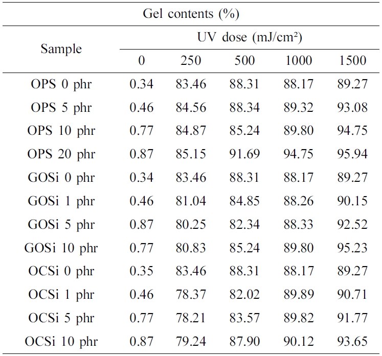 가교제 종류에 따라 젤 함량 수치가 증가하는 정도에는 약간의 차이를 나타냈다. OPS에서 자외선을 250 mJ/cm² 이상 조사했을 경우 젤 함량 수치가 충분히 증가했지만, OCSi 및 GOSi의 경우에는 1000 mJ/cm² 이상의 자외선을 조사해야 유사한 정도의 젤 함량 수치를 나타내었다. 이는 탄소재료가 PSA에 첨가되면서 점착층에 대한 자외선 투과율이 감소하게 되어 OPS에 비해 훨씬 많은 양의 자외선을 조사해 주어야만 유사한 정도의 가교반응이 진행된다는 것을 확인할 수 있었다.24
