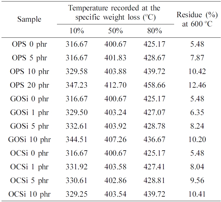 내열성 분석. 질소 분위기 25~600 oC 범위에서 아크릴계 공중합체와 OPS, GOSi 및 OCSi 가교제를 사용하여 1500 mJ/cm²의 자외선 조사로 경화시킨 TGA 분석 결과를 Figure 4에 나타내었다. 가교제의 양이 증가할수록 열분해 온도가 높아지고 열분해 잔사량이 증가하는 것을 확인하였고 그 결과를 정리하여 Table 3에 나타내었다.
