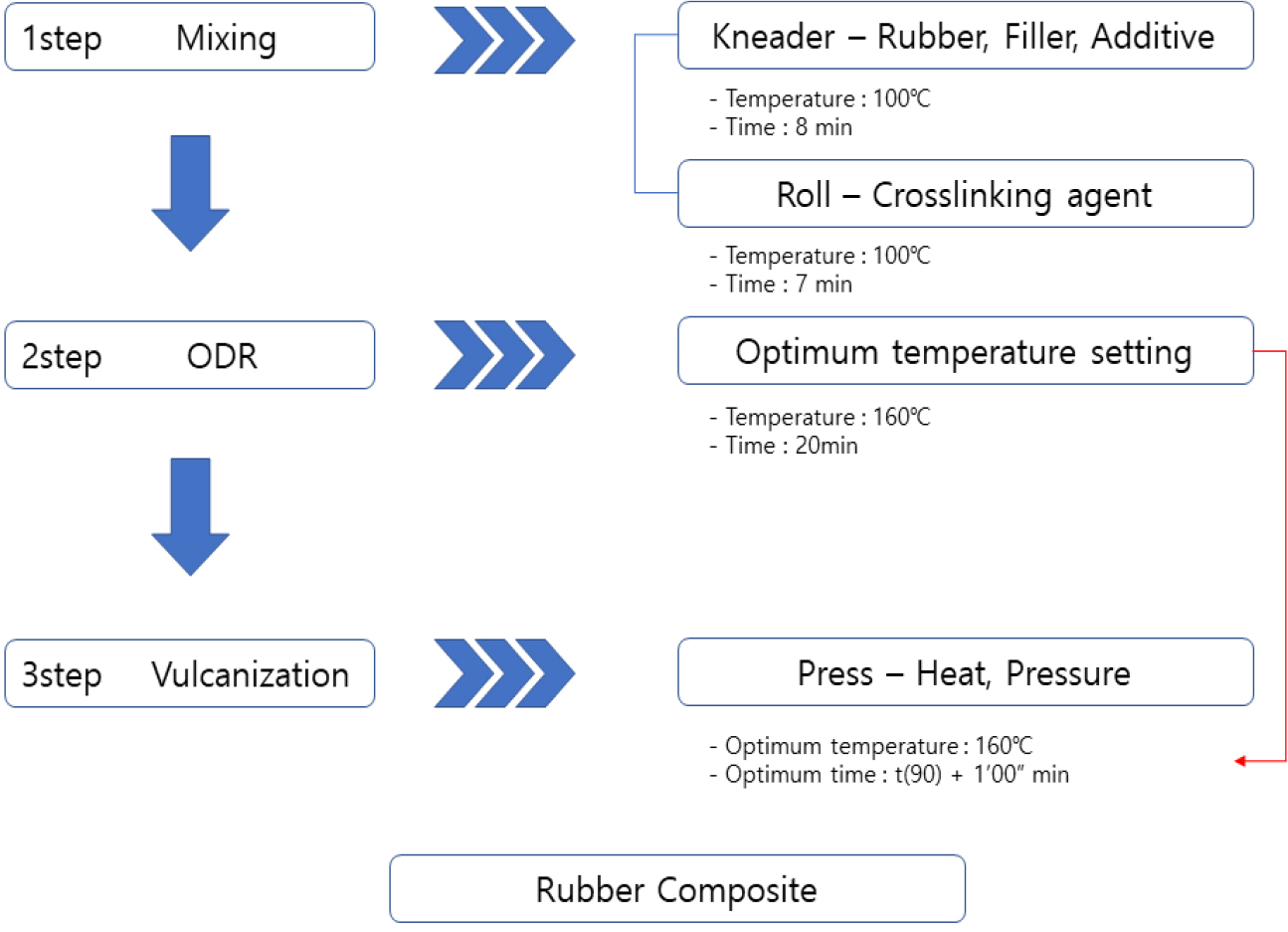 고무 시편 제조. 만들어진 생고무를 ODR(oscillating disk rheometer, Zwick, model 4308)을 이용하여 적정 가교시간을 확인하였다. 가교시간은 160 oC에서 얻어진 최대 토크로부터 결정하였다. 그 후 핫 프레스(HP 152-SY, 극동)를 이용하여 고무 시편을 제조하였다.
