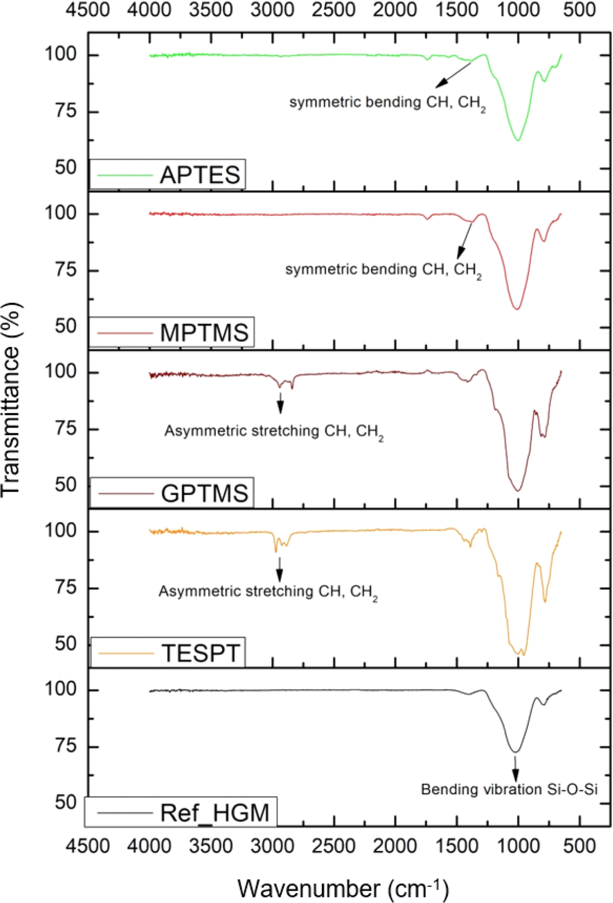 HGM 표면 개질 반응 특성. FTIR 특성 비교: HGM의 표면에 실란 커플링제가 결합되었는지를 확인하기 위해 FTIR을 이용하여 분석하였다. 그 결과를 Figure 2에 나타내었다.