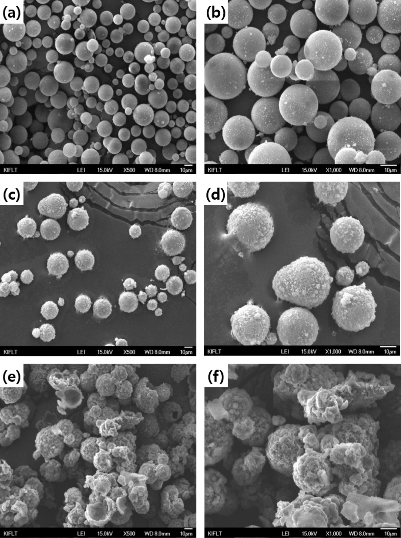 Figure 3. SEM image of surface modification reaction with TESPT: (a) Ref_HGM ×500; (b) Ref_HGM ×1000; (c) surface modification HGM with TESPT ×500; (d) surface modification HGM with TESPT ×1000; (e) surface modification hydroxylated HGM with TESPT ×500; (f) surface modification hydroxylated HGM with TESPT ×1000. Scale bar indicates 10 μm.