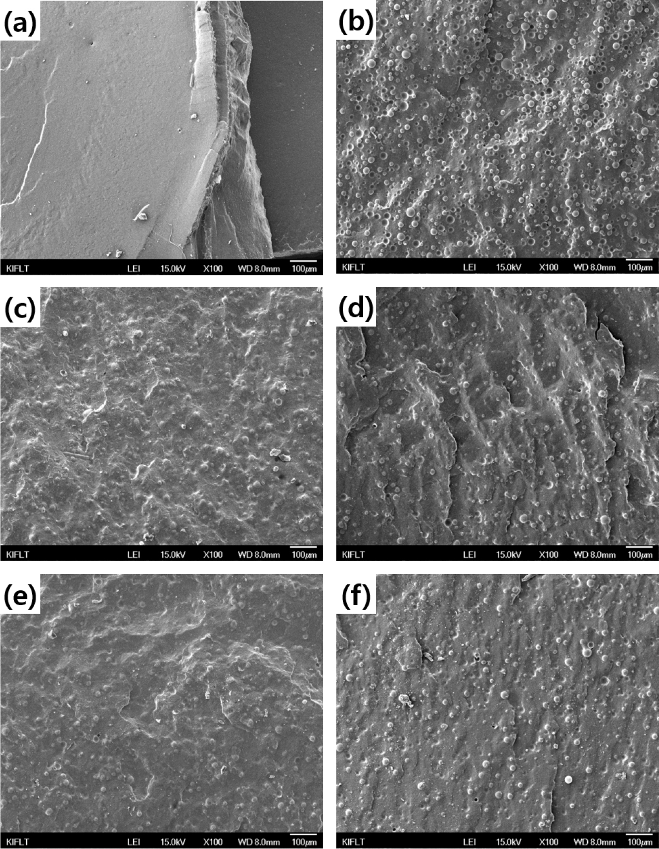 Figure 4. SEM images of rubber composite with surface modified HGM with various silane coupling agent: (a) no filler; (b) Ref_HGM; (c) TESPT; (d) GPTMS; (e) MPTMS; (f) APTES. Scale bar indicates 100 μm.