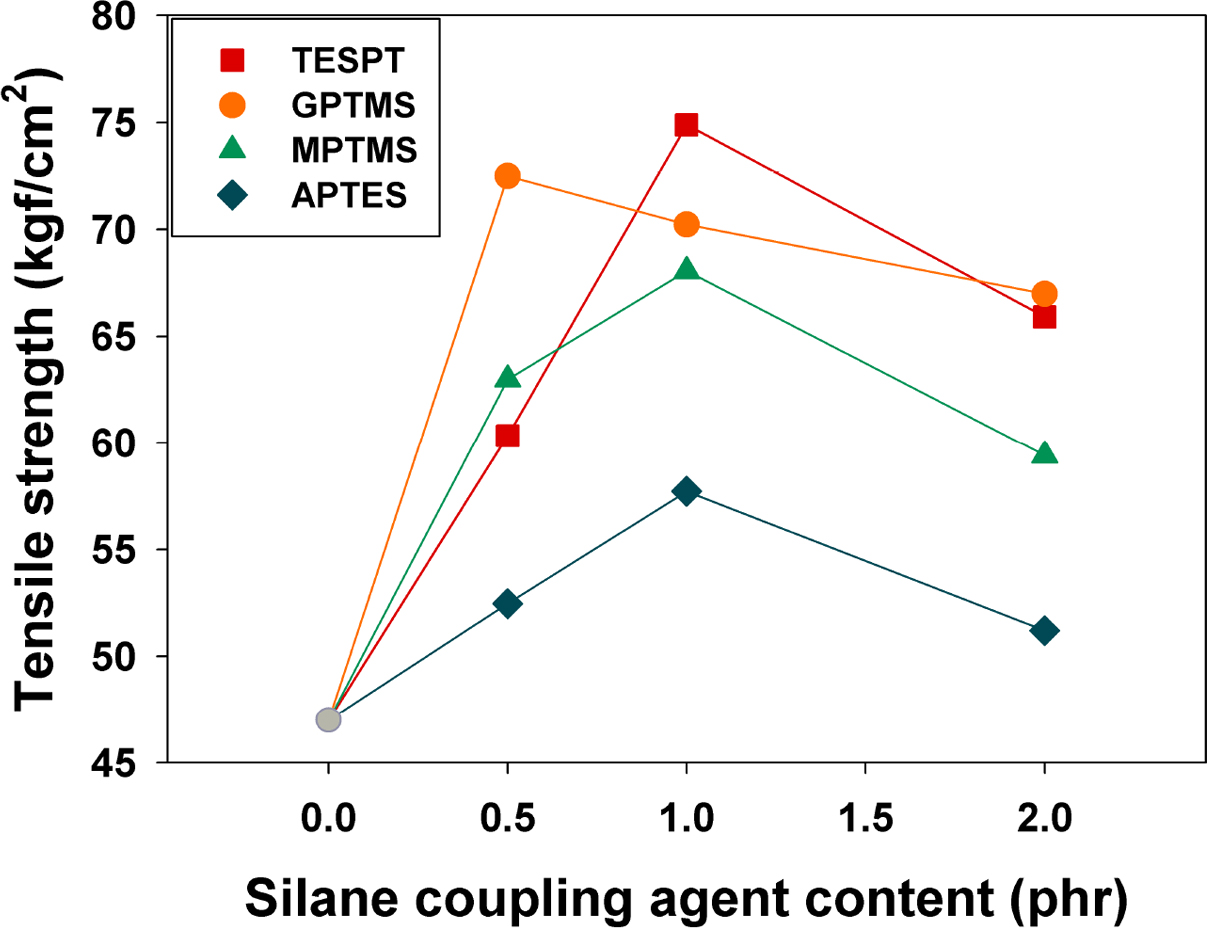 Figure 5. Tensile strength for surface modified HGM with various silane coupling agents (TESPT, GPTMS, MPTMS, and  APTES) as a function of silane coupling agent content.