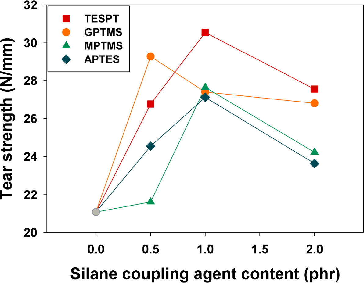Figure 6. Tear strength or surface modified HGM with various silane coupling agents (TESPT, GPTMS, MPTMS, and  APTES) as a function of silane coupling agent content.